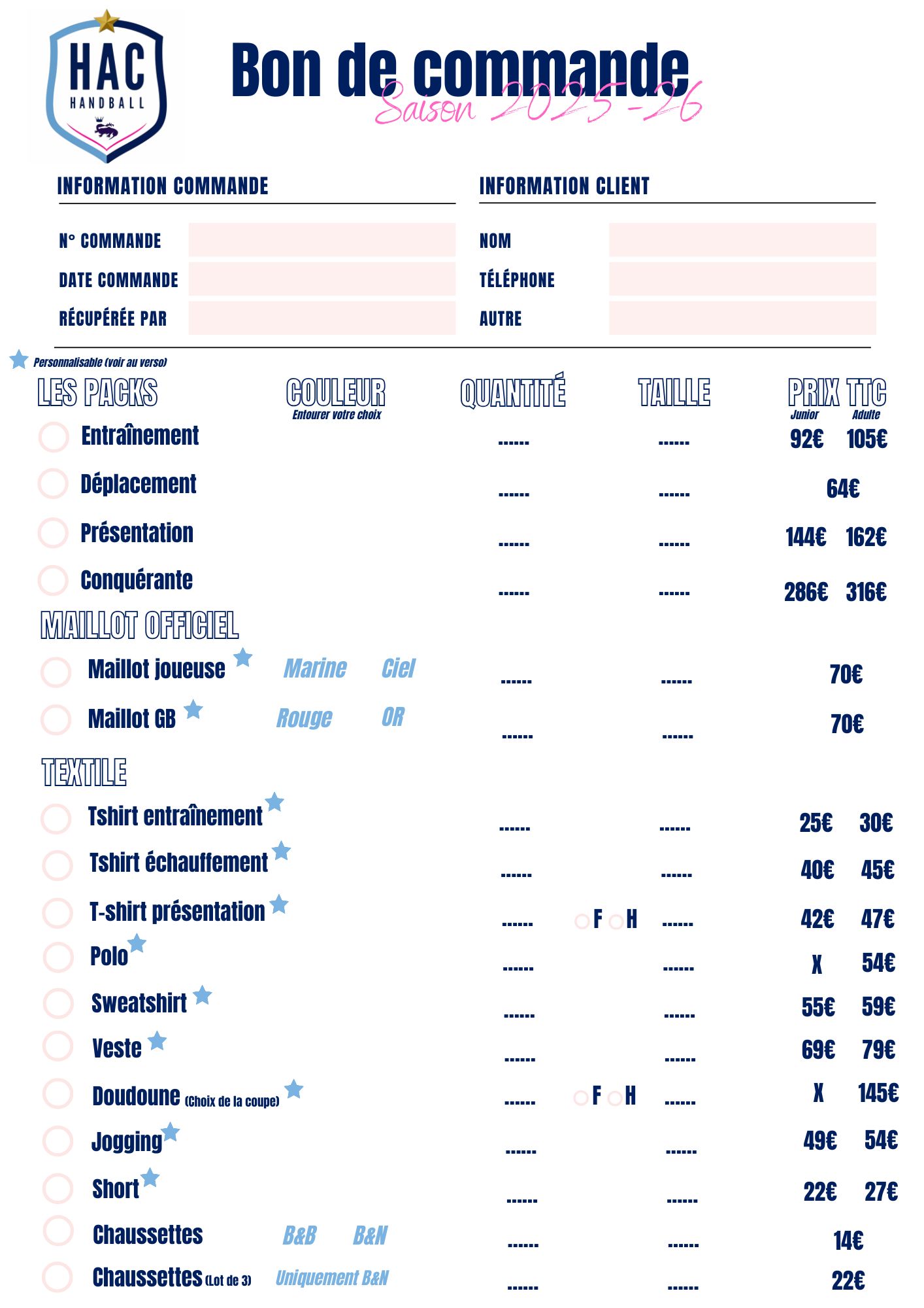 Envie de porter fièrement les couleurs du club ? Le bon de commande officiel du HAC Handball est enfin disponible ! Vous y trouverez tout le nécessaire pour être au top sur et en dehors du terrain : maillots, textiles et accessoires aux couleurs du HAC.